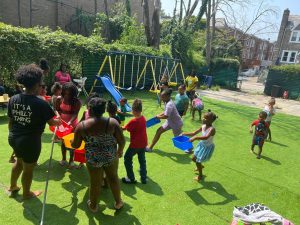 Engaging physical activities in the fresh air, where children can explore nature, develop gross motor skills, and enjoy teamwork and imaginative play.